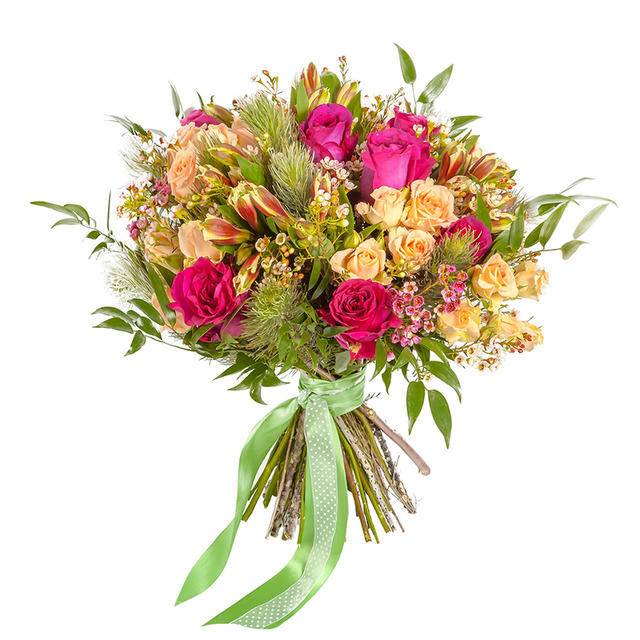 Прекрасный букет в светлых тонах передаст без лишних слов ваши эмоции и чувства. Он отлично подходит в качестве подарка по любому поводу, включая День Рождения, повышение, свидание или как способ признаться в любви, напомнить о своих нежных чувствах. Одноголовые и кустовые розы выразят нежность и заботу, а альстромерии – хороший способ пожелать процветания и удачи. Стильная зеленая лента перевязывает букет, не используется целлофан, такое решение понравится все любителям естественного вида цветов.
