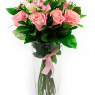 Невероятно красивые альстромерии и восхитительные розы, соединенные воедино, непременно порадуют виновницу торжества, вызвав улыбку и теплые чувства к дарителю.